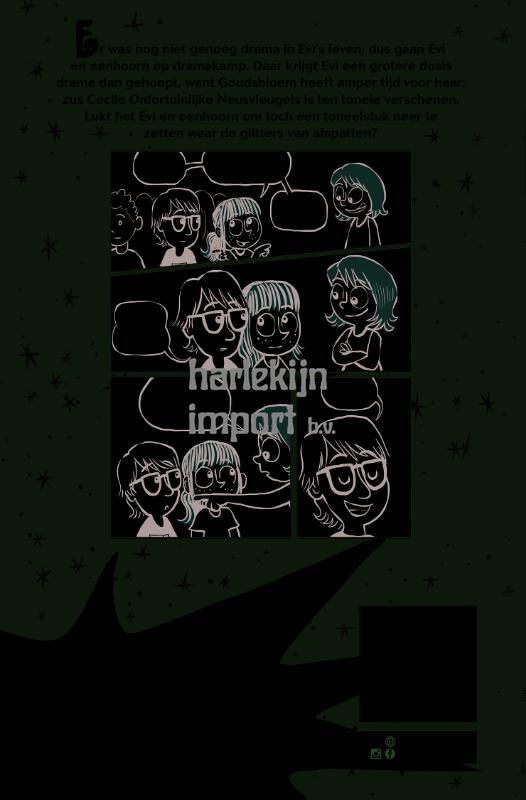 Er was nog niet genoeg drama in Evi’s leven, dus gaan Evi en eenhoorn op dramakamp. Daar krijgt Evi een grotere dosis drama dan gehoopt, want Goudsbloem heeft amper tijd voor haar: zus Cecile Onfortuinlijke Neusvleugels is ten tonele verschenen. Lukt het Evi en eenhoorn om toch een toneelstuk neer te zetten waar de vonken van afspatten?