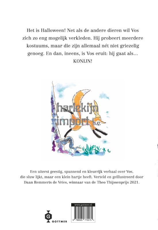‘Feest met Vos’ is een nieuw avontuur in de serie over de niet-zo-sluwe Vos. In dit prentenboek is Daan Remmerts de Vries – winnaar van de Theo Thijssenprijs en auteur van ‘Vos is een boef’ en ‘Dokter Vos’ – op zijn best. Het is Halloween en Vos wil zich zo griezelig mogelijk verkleden dus hij gaat als… konijn. Want weet je wel hoe scherp die tanden zijn? Hij vertrekt vol goede moed en met lange oren op zoek naar snoep, maar raakt onderweg steeds meer teleurgesteld. Wat een raar feest is dit: Vos ziet dieren die als mensen verkleed zijn, als bontjas, of zelfs als vos… Alsof hij eng is! Gelukkig krijgt dit rare feest nog een vrolijk staartje, als de angstaanjagende tijger die hem achtervolgt opeens een lieve meisjesvos blijkt te zijn.