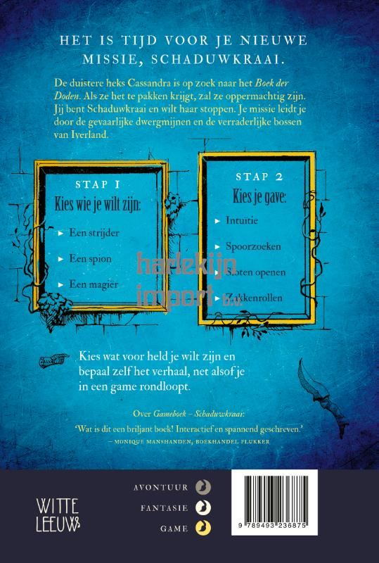 Het is tijd voor je nieuwe missie, Schaduwkraai. In dit boek ben jij de held. Jij bent een Schaduwkraai en je krijgt van de magiër Tabulas een opdracht die je niet bevalt. Je beste vriendin Isolde krijgt een veel belangrijkere. Zij moet op zoek naar het Boek der Doden. Ontevreden begin je aan je missie, die gaandeweg steeds interessanter wordt, als je steeds meer sporen van de gevaarlijke heks Cassandra ontdekt. Lukt het jou de raadsels op te lossen? Kraak je de codes? Versla je de steengolems en de reuzenwormen? De keuze is na elke alinea steeds aan jou, jij bepaalt het verhaal. Je missie leidt je dwars door de goudmijnen, langs een kerkhof vol skeletstrijders, helemaal naar het noorden, waar Cassandra zich schuilhoudt. Lees ook: Gameboek - Schaduwkraai.