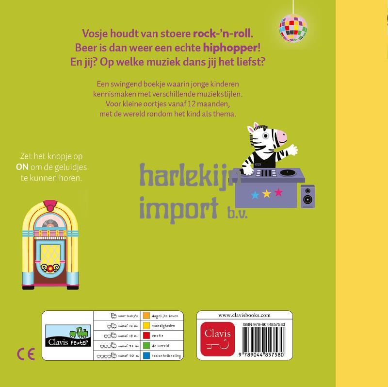 Vosje houdt van stoere rock-’n-roll. Beer is dan weer een echte hiphopper! En jij? Op welke muziek dans jij het liefst? Een swingend boekje waarin jonge kinderen kennismaken met verschillende muziekstijlen. Voor kleine oortjes vanaf 12 maanden, met de wereld rondom het kind als thema.
