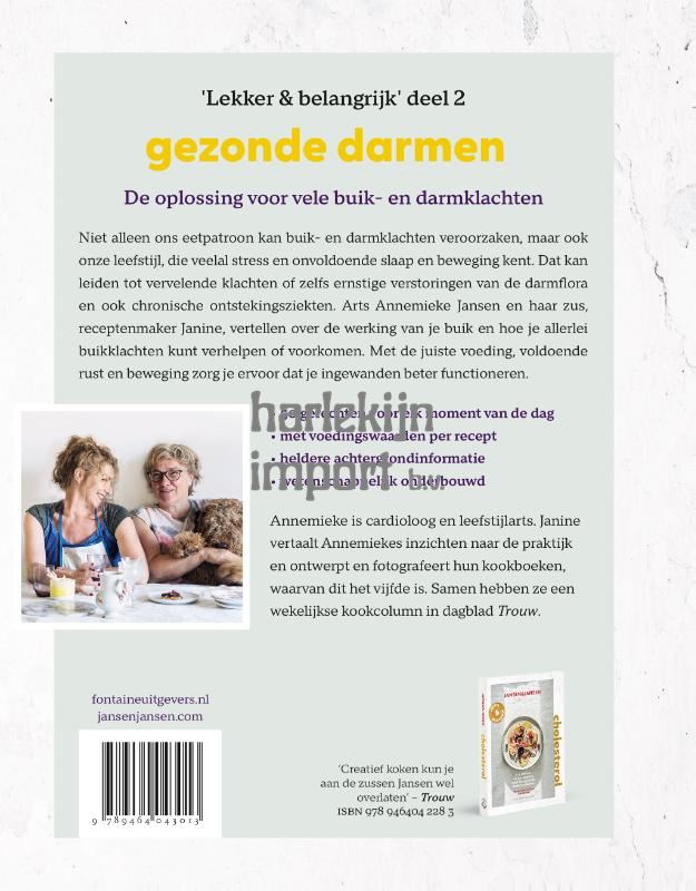 De oplossing voor vele buik- en darmklachten Bijna één op de vier mensen heeft regelmatig last van buik- of darmklachten. Zestig procent hiervan is vrouw en bovendien veelal in de overgang. Maar ook veel mannen kampen met vervelende gezondheidsproblemen met buik en darmen. Die variëren van relatief onschuldige darmklachten tot chronische ontstekingsziekten en ernstige verstoringen van de darmflora. Van invloed hierop is niet alleen ons eetpatroon maar ook onze moderne leefstijl. Stress, onvoldoende bewegen, slecht slapen: het heeft allemaal een negatieve invloed op de ingewanden. Cardioloog Annemieke Jansen en haar zus en kok Janine Jansen leggen in Gezonde darmen uit wat wél gezond is voor je buik. Naast informatie over een goede hormoonhuishouding, immuniteit, pre-, pro- en postbiotica, veelvoorkomende klachten als glutenallergie en PDS, schadelijke voedingsstoffen als verzadigde vetten, suikers en snelle koolhydraten, en goede ingrediënten om je darmflora in balans te brengen, vind je in Gezonde darmen 50 recepten om buik- en darmklachten te bestrijden. Met de juiste voeding, voldoende rust en beweging zorg je er zelf voor dat ontstekingen geremd worden en je ingewanden beter functioneren. Niet moeilijk, wel lekker en met positieve resultaten. Zo voel je je al snel lichamelijk en geestelijk prettiger. - Bewezen gezond én lekker eetpatroon - 50 gerechten voor elk moment van de dag - Wetenschappelijk onderbouwd Gezonde darmen is het tweede deel in de serie 'Lekker & belangrijk' van de zussen Jansen. Elk deel is gewijd aan een bepaald probleem en leert je wat je zelf kunt doen om je gezondheid te verbeteren. Het eerste deel gaat over cholesterol. Annemieke is cardioloog in het Groene Hart Ziekenhuis in Gouda en kampte zelf jarenlang met het prikkelbare-damsyndroom. Janine vertaalt Annemiekes inzichten naar de praktijk, met eenvoudige, doenbare gerechten. Ook ontwerpt en fotografeert ze hun kookboeken, waarvan dit het vijfde is. Samen hebben ze een wekelijkse kookcolumn in dagblad Trouw.