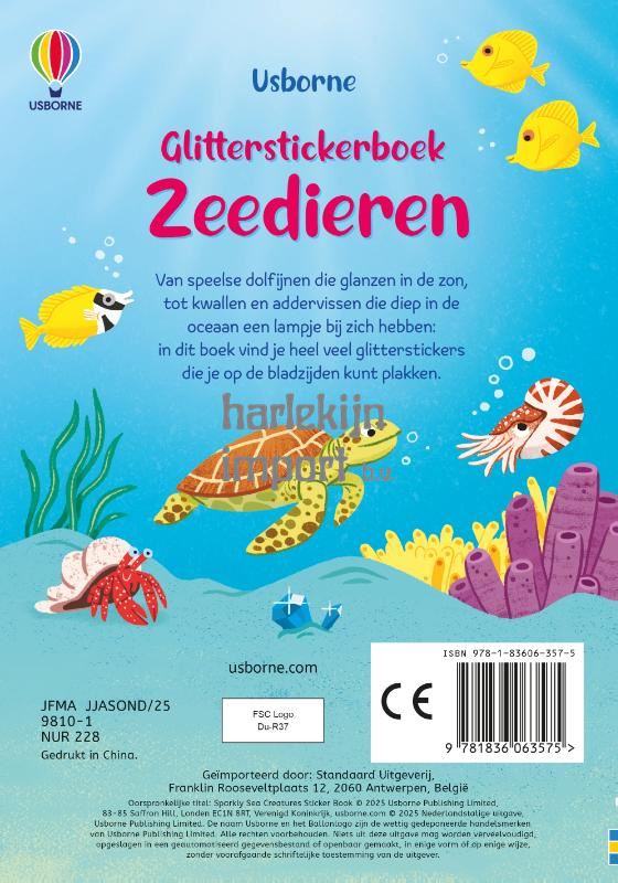 Van speelse dolfijnen die glanzen in de zon, tot kwallen en addervissen die diep in de oceaan een lampje bij zich hebben: in dit boekje vind je heel veel glitterstickers die je op de bladzijden kunt plakken.