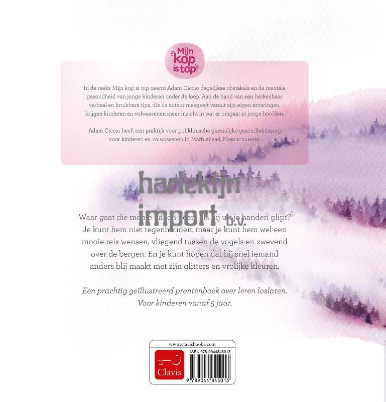 Waar gaat die mooie ballon heen, als hij uit je handen glipt? Je kunt hem niet tegenhouden, maar je kunt hem wel een mooie reis wensen, vliegend tussen de vogels en zwevend over de bergen. En je kunt hopen dat hij snel iemand anders blij maakt met zijn glitters en vrolijke kleuren. Een prachtig geïllustreerd prentenboek over leren loslaten. Voor kinderen vanaf 5 jaar. In de reeks Mijn kop is top, neemt Adam Ciccio dagelijkse obstakels en de mentale gezondheid van jonge kinderen onder de loep. Aan de hand van een herkenbaar verhaal en een bijsluiter, die de auteur schrijft vanuit eigen ervaringen, krijgen kinderen en volwassenen meer inzicht in wat er omgaat in jonge hoofden. Adam Ciccio heeft een praktijk voor poliklinische geestelijke gezondheidszorg voor kinderen en volwassenen in Marblehead, Massachusetts.