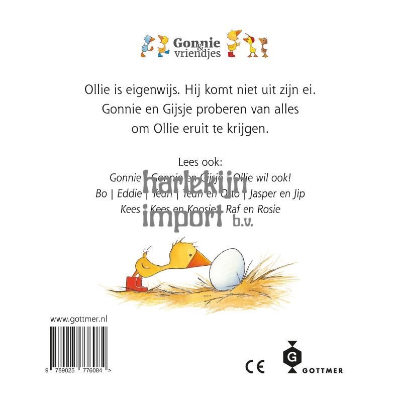 <p>Ollie is heel eigenwijs! Daar kom je achter in dit verhaaltje in de 'Gonnie en vriendjes'-serie . Ollie zit in zijn ei, en daar zit hij prima. Hij komt er niet uit. Gonnie en Gijsje proberen hem over te halen, maar hij luistert niet. Hij rolt bij ze vandaan, of verstopt zich in zijn nest. Maar heel misschien voegt Ollie zich aan het eind van het boekje toch bij Gonnie en al haar vriendjes. Ollie is - net als zo veel van de kleine lezers - heerlijk koppig, met een heel eigen karakter.<br><br>De hele 'Gonnie'-serie is verkrijgbaar in een prachtige, stevige en frisse uitvoering van karton, die perfect bij Oliver Dunrea's geliefde, schattige illustraties. De kartonboekjes voor baby's en peuters zijn een prachtig kraamgeschenk, en ook leuk om keer op keer voor te lezen! Lees ook de andere elf boekjes uit de serie, zoals 'Gonnie', 'Gonnie en Gijsje', 'Kees' en nog veel meer!</p>