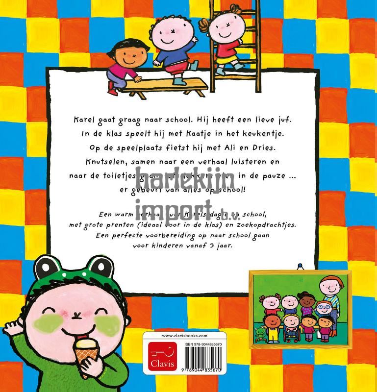 Een warm verhaal over Karels dagje op school, met grote prenten (ideaal voor in de klas) en zoekopdrachtjes. Een perfecte voorbereiding op naar school gaan voor kinderen vanaf 3 jaar. Karel gaat graag naar school. Hij heeft een lieve juf. In de klas speelt hij met Kaatje in het keukentje. Op de speelplaats fietst hij met Ali en Dries. Knutselen, samen naar een verhaal luisteren en naar de toiletjes gaan, iets lekkers eten in de pauze … er gebeurt van alles op school!