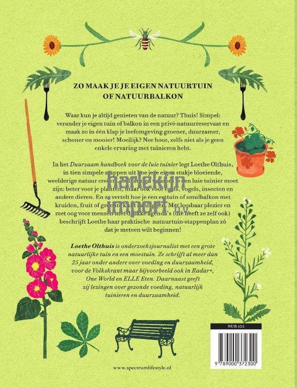 In hetDuurzaam handboek voor de luie tuinier legt Loethe Olthuis, journalist en hartstochtelijk tuinliefhebber, in tien simpele stappen uit hoe je je eigen stukje bloeiende, weelderige natuur creërt. Ze vertelt je bijvoorbeeld waar gratis planten te vinden zijn. Hoe je je tuin klimaatbestendig kunt maken. Welke bloemen de meeste vlinders en bijen trekken en hoe er het hele jaar door kleur te zien is. Waarom je juist een luie tuinier moet zijn, zodat egels, vogels, insecten en andere dieren zich thuis voelen. En ze laat zien hoe je je eigen eettuin of smulbalkon met fruit en groente kunt aanleggen: kruiden in potten zijn al een prima begin.