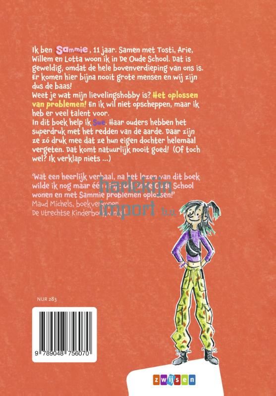 Ik ben Sammie, 11 jaar. Samen met Tosti, Arie, Willem en Lotta woon ik in De Oude School. Dat is geweldig, omdat de hele bovenverdieping van ons is. Er komen hier haast nooit grote mensen en wij zijn dus de baas! Weet je wat mijn lievelingshobby is? Het oplossen van problemen! En ik wil niet opscheppen, maar ik heb er veel talent voor. In dit boek help ik Sue. Haar ouders hebben het superdruk met het redden van de aarde. Daar zijn ze zó druk mee dat ze hun eigen dochter helemaal vergeten. Dat komt natuurlijk nooit goed! (Of toch wel? Ik verklap niets …) Pyjamaparty’s, kussengevechten en spannende spelletjes … alles kan in De Oude School, want hier woont Sammie samen met alle kinderen op de bovenverdieping. Sammie vindt het leuk om problemen op te lossen en in dit boek heeft haar vriendin Sue haar hulp nodig. Haar ouders zijn namelijk altijd bezig en Sue is bang dat ze het zo druk hebben dat ze haar verjaardag vergeten. Tijd voor actie dus! Sammie besluit Sue te helpen, want haar verjaardag móét gevierd worden. Maar dan rolt Sammie van de ene grappige situatie in de andere. Auteur Elisa van Spronsen weet hoe ze kinderen geboeid laat lezen door dit grappige verhaal vol aansprekende illustraties van Marja Meijer. Dat is met plezier leeskilometers maken voor kinderen van 9 jaar en ouder. Het goede nieuws: er zijn meer boeken op komst!