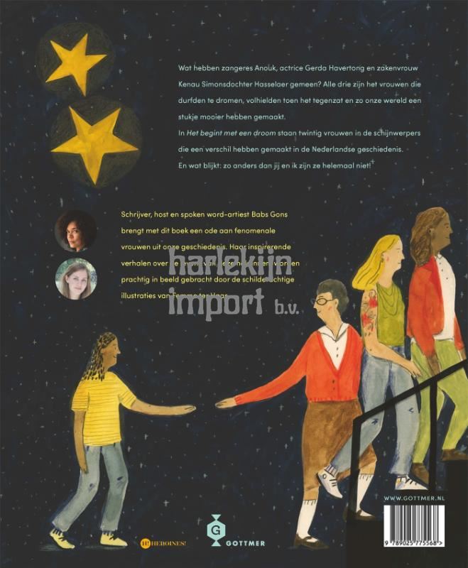 ‘Het begint met een droom’ is een inspirerend en informatief boek waarin toegankelijk over de levens 20 heldinnen uit de geschiedenis van het Nederlands koninkrijk wordt verteld. ‘Het begint met een droom – 20 heldinnen die Nederland kleur geven’ is geschreven door Babs Gons, de spoken word-koningin van Nederland. Haar verhalen in dichtvorm zijn een ode aan vrouwen uit Nederland, Suriname en de Nederlandse Antillen. De prachtige illustraties zijn van Femme ter Haar. Wat hebben arts Harriette Verwey, activiste Faiza Oulahsen en zakenvrouw Kenau Simonsdochter gemeen? Alle drie zijn het vrouwen die durfden te dromen, volhielden toen het tegenzat en daardoor onze wereld een stukje beter hebben gemaakt. In ‘Het begint met een droom’ staan 20 vrouwen in de schijnwerpers die een verschil hebben gemaakt in de geschiedenis van het Nederlands koninkrijk. En wat blijkt: zo anders dan jij en ik zijn ze helemaal niet! Schrijver, theatermaker en spoken word-artiest Babs Gons brengt met ‘Het begint met een droom’ een ode aan fenomenale vrouwen uit onze geschiedenis. In dit inspirerende, informatieve boek vertelt ze op een toegankelijke manier over de levens van deze heldinnen. Femme ter Haar maakte de schilderachtige illustraties waarin onder meer Wilhelmina Drucker, Khadija Arib en Nikkie de Jager van de pagina’s spatten.