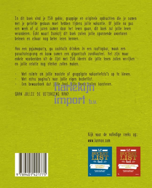 In dit boek vind je 250 gekke, grappige en originele opdrachten die je samen met je geliefde gedaan moet hebben tijdens jullie vakantie. Of jullie nu pas een week of al jaren samen door het leven gaan, dit boek zal jullie leven veranderen. Écht waar! Dankzij dit boek zullen jullie spannende avonturen beleven en elkaar nog beter leren kennen. Hou een pyjamaparty, ga cocktails drinken in een rooftopbar, maak een parachutesprong en bouw samen een gigantisch zandkasteel. Het zijn maar enkele voorbeelden uit de lijst met 250 ideeën die jullie leven zullen verrijken en jullie relatie nog sterker zullen maken. Met ruimte om jullie mooiste of grappigste vakantiefoto's op te kleven. Met extra pagina's voor jullie eigen bucketlist. Een bewaarboek dat jullie heel jullie leven zullen koesteren. GAAN JULLIE DE UITDAGING AAN?