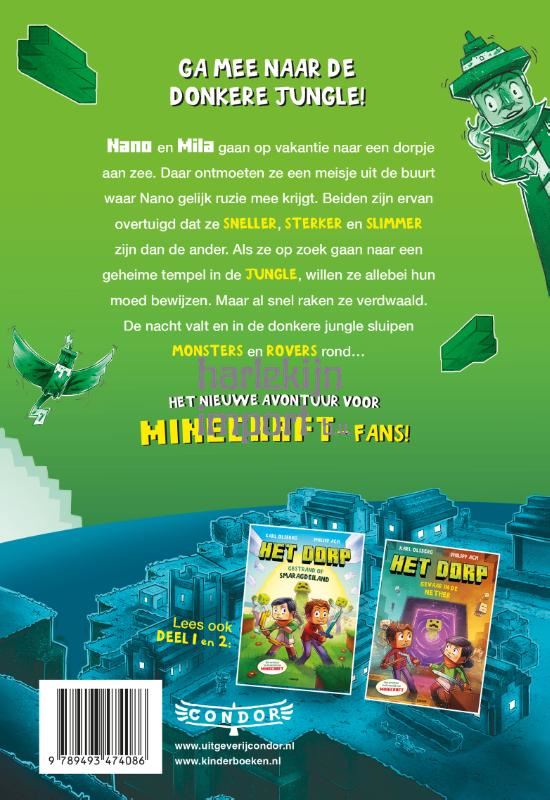 In Verdwaald in de jungle beleven Nano en Mila een nieuw avontuur als ze op vakantie gaan naar een dorpje aan zee. Daar ontmoeten ze een meisje uit de buurt waar Nano gelijk ruzie mee krijgt. Allebei zijn ze ervan overtuigd dat ze sneller, sterker en slimmer zijn dan de ander. Als ze op zoek gaan naar een geheime tempel in de jungle, willen ze ieder hun moed bewijzen. Maar al snel raken ze verdwaald… De nacht valt en in de donkere jungle sluipen monsters en rovers rond! In dit derde deel van de serie Het Dorp kunnen fans van Minecraft zich laten meeslepen door het nieuwe avontuur van Nano en Mila!