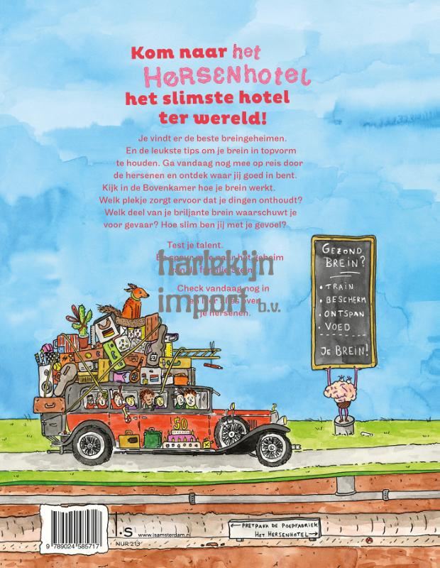 Na het succesvolle Pretpark de Poepfabriek over je darmen is er nu Het Hersenhotel. In dit boek nemen auteurs Marja Baseler en Annemarie van den Brink je mee op reis naar de binnenkant van je hoofd en ontdek je wat jouw talenten zijn. Met paginagrote illustraties van Tjarko van der Pol. Je brein is een supermachine. Het regelt alles wat er in je lichaam gebeurt. Dat je ademt en je hart klopt. Dat je kunt praten, lopen, horen en zien. Maar je brein regelt veel meer! Heb je bijvoorbeeld aanleg voor voetballen of muziek maken? Ben je goed in taal of rekenen? Heb je veel fantasie of kun je heel goed samenwerken? Het zit allemaal in je brein! Check vandaag nog in het Hersenhotel in en ontdek waar jij goed in bent. Met een stappenplan om je brein gezond te houden, een spannende speurtocht, een talententest en heel veel grappige en interessante weetjes! ‘Een kijkje in ons binnenste, op een grappige en toegankelijke manier.’ AD over Pretpark de Poepfabriek