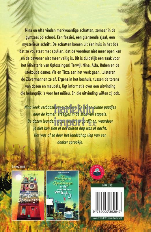 Een fossiel, een glinsterend schrift, een antieke sjaal… Nina en Alfa vinden allerlei merkwaardige schatten op school. Die komen uit een huis in het bos dat zo vol met spullen staat, dat de deur niet meer opengaat. De meester van groep 3, die er is opgegroeid, is er wanhopig van. Nina, Alfa, Ruben en de stokoude mevrouw Vis en Tirza de Vries twijfelen geen seconde: dit is een zaak voor het Ministerie van Oplossingen!
