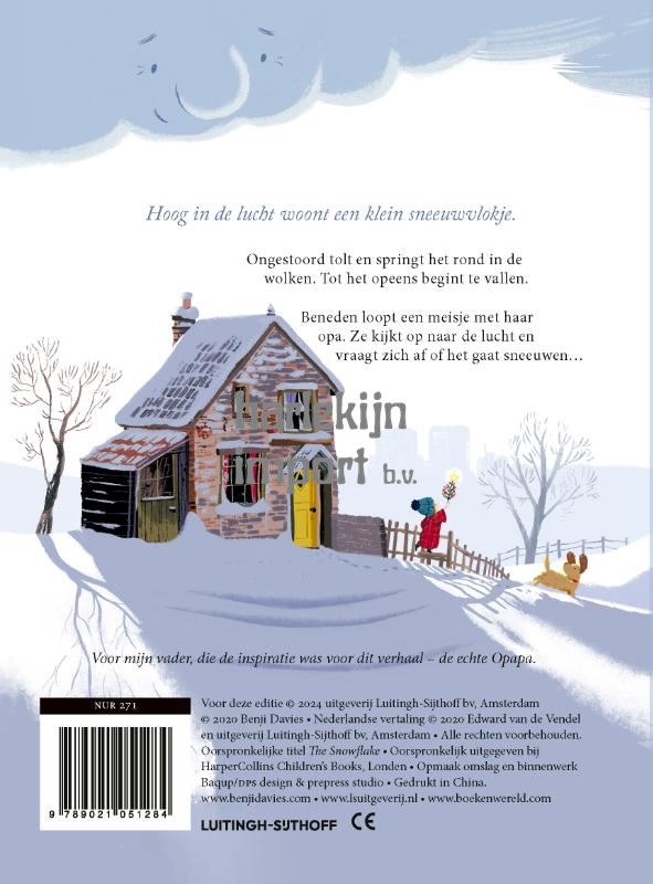 Benji Davies' hartverwarmende prentenboek Het sneeuwvlokje is verkrijgbaar in een fraaie gebonden kartonuitgave. Eerder verschenen ook De kleine walvis, De kleine walvis in de winter, Het eiland van opa, Oma Vogeltje en Donderkopje in een stevige kartonnen uitgave met ronde hoeken. Hoog in de wolken woont een klein sneeuwvlokje. Ongestoord tolt en springt het rond in de wolken, steeds harder en harder. Tot het opeens begint te vallen… Beneden loopt een meisje met haar opa. Ze kijkt op naar de lucht en vraagt zich af of het gaat sneeuwen… Het sneeuwvlokje is een prachtig geïllustreerd verhaal over het vinden van je plek in de wereld en de ontdekking dat het mooiste cadeau dat je kunt krijgen een cadeau is om te geven.