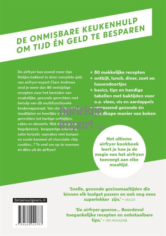 Eén op de acht huishoudens in Nederland heeft een airfryer, maar die wordt meestal alleen gebruikt ter vervanging van de frituurpan, terwijl het apparaat oneindig veel meer mogelijkheden kent. Het ultieme airfryer kookboek is de meest complete gids voor het bereiden van smakelijke, gezonde gerechten met behulp van dit multifunctionele keukenapparaat. De meer dan 80 veelzijdige recepten laten je zien dat de airfryer veel meer kan dan friet bakken. Van doordeweekse maaltijden en heerlijke vleesgerechten tot hartige ontbijtjes, cakes en desserts. Het ultieme airfryer kookboek leert je hoe je de magie van het airfryen in elke maaltijd kunt verwerken. - 80 recepten voor ontbijt, lunch en diner - basics, tips en handige tabellen met baktijden voor o.a. vlees, vis en aardappels - verrassend gezonde manier van koken Van ontbijtmuffins, rösti van knolselderij, granola en bruschetta tot kipsaté, tomatenbasilicumsoep en bagelpizza's. En wat dacht je van knapperige chili-tofu, gevulde aubergines of loaded nacho's? Vegan hotdogs met balsamico-uien, zalm teriyaki met groene groenten, zoete-aardappelwedges, bloemkoolbites, parmezaankoekjes, cupcakes met banaan en zoute karamel of chocolate chip cookies...? Te veel om op te noemen en álles uit de airfryer! 'Van eenvoudige doordeweekse maaltijden tot complete vleesgerechten en zelfs desserts: je zult zien dat je de magie van het airfryen bij elke culinaire gelegenheid kunt gebruiken.' - Sunday Express 'De airfryer-goeroe... Boordevol toegankelijke recepten en onbetaalbare tips.' - OK! Magazine 'Snelle, gezonde gezinsmaaltijden die binnen elk budget passen en ook nog eens superlekker zijn.' - Hello!
