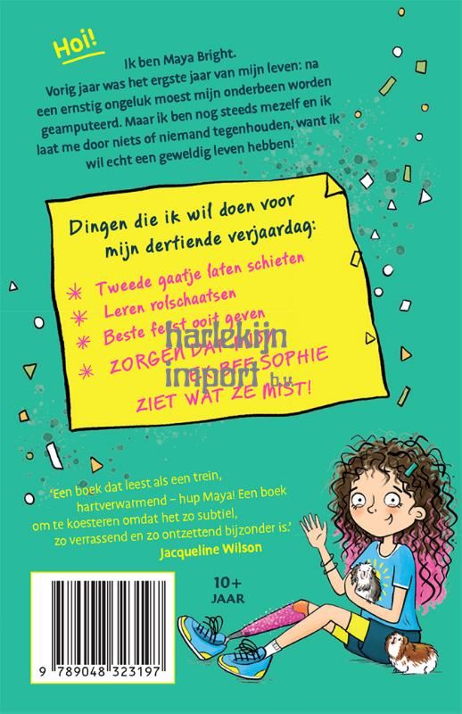 Hoi! Ik ben Maya Bright. Vorig jaar was het ergste jaar van mijn leven: na een ongeluk moest mijn onderbeen worden geamputeerd. Maar ik ben nog steeds mezelf en ik laat me door niets of niemand tegenhouden, want ik wil echt een geweldig leven hebben! Dingen die ik wil doen voor mijn dertiende verjaardag: * Tweede gaatje laten schieten * Leren rolschaatsen * Beste feest ooit geven * ZORGEN DAT MIJN EX-BFF SOPHIE ZIET WAT ZE MIST! 'Een boek dat leest als een trein, hartverwarmend - hup Maya! Een boek om te koesteren omdat het zo subtiel, zo verrassend en zo ontzettend bijzonder is.' Jacqueline Wilson