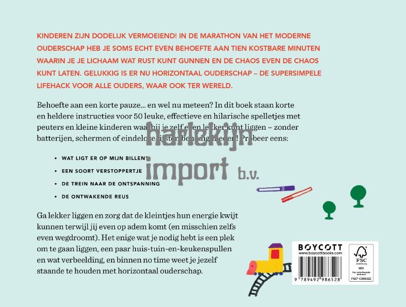 Kinderen zijn ontzettend leuk – maar laten we eerlijk wezen – óók doodvermoeiend. Soms heb je als ouder even tien minuutjes nodig om weer op te kunnen laden. Gelukkig is er een oplossing: horizontaal ouderschap. Hiermee kun jij je kinderen creatief bezig houden terwijl je zelf rust. Klinkt geweldig? Het enige wat je nodig hebt, is een comfortabele ondergrond, een paar huishoudelijke artikelen en de verbeelding van je kind. Op die manier kan ook jij de kunst van horizontaal ouderschap onder de knie krijgen. Horizontaal ouderschap is de supereenvoudige opvoedingshack voor iedereen die even ‘een break’ nodig heeft. Met vijftig hilarische spelletjes kun je je kinderen vanaf de bank vermaken terwijl je jezelf een beetje rust gunt.