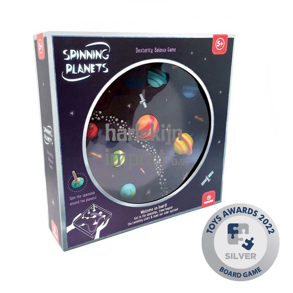 A set of 9 wooden spinning tops – 8 planets & 1 spaceship –, 8 Info Cards & 24 Mission Cards that has multiple layers of educational & play value: