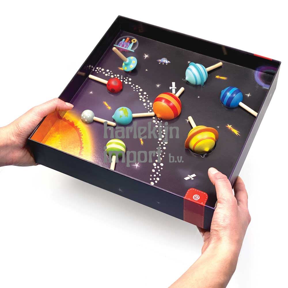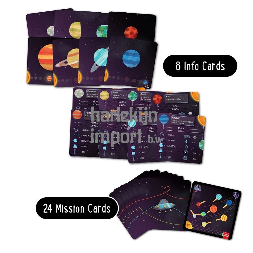 Een set van 9 houten tollen – 8 planeten & 1 ruimteschip –, 8 infokaarten & 24 missiekaarten met meerdere educatieve en speelwaardelagen:
