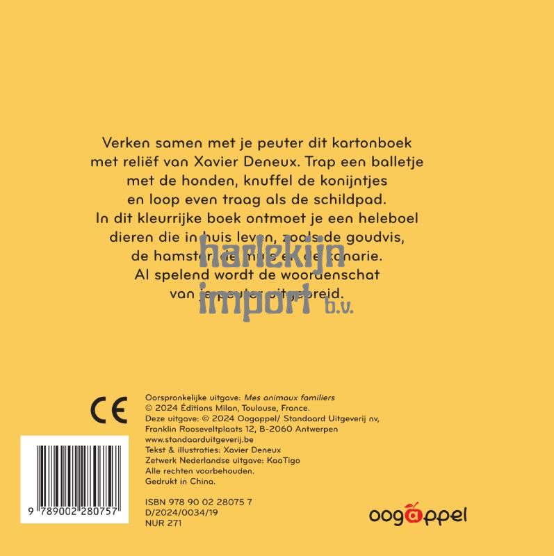 Verken samen met je peuter dit kartonboek met reliƫf van Xavier Deneux. Trap een balletje met de honden, knuffel de konijntjes en loop even traag als de schildpad. In dit kleurrijke boek ontmoet je een heleboel dieren die in huis leven, zoals de goudvis, de hamster, de muis en de kanarie. Al spelend wordt de woordenschat van je peuter uitgebreid.