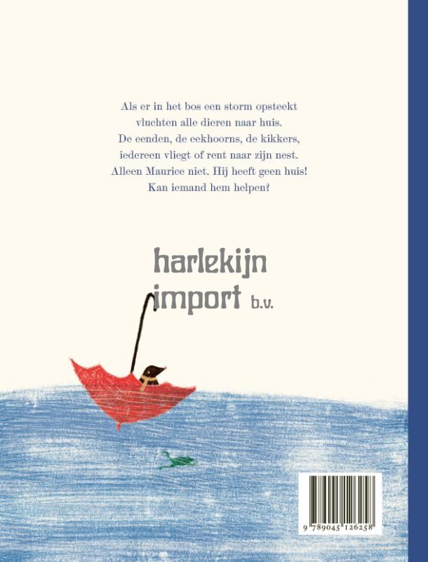 Als het in het bos begint te regenen, te waaien en ten slotte hard te stormen vluchten alle dieren naar huis. De eenden, de eekhoorns, de kikkers… iedereen vliegt of rent naar zijn nest. Alleen Maurice niet. Hij heeft geen huis! Hij is veel te groot, er is geen plaats voor hem. Helemaal alleen raakt hij verloren in de storm. Maar gelukkig is er Mol. Die heeft van de wind diep onder de grond geen last. Maar de tranen van Maurice hoort hij wel…