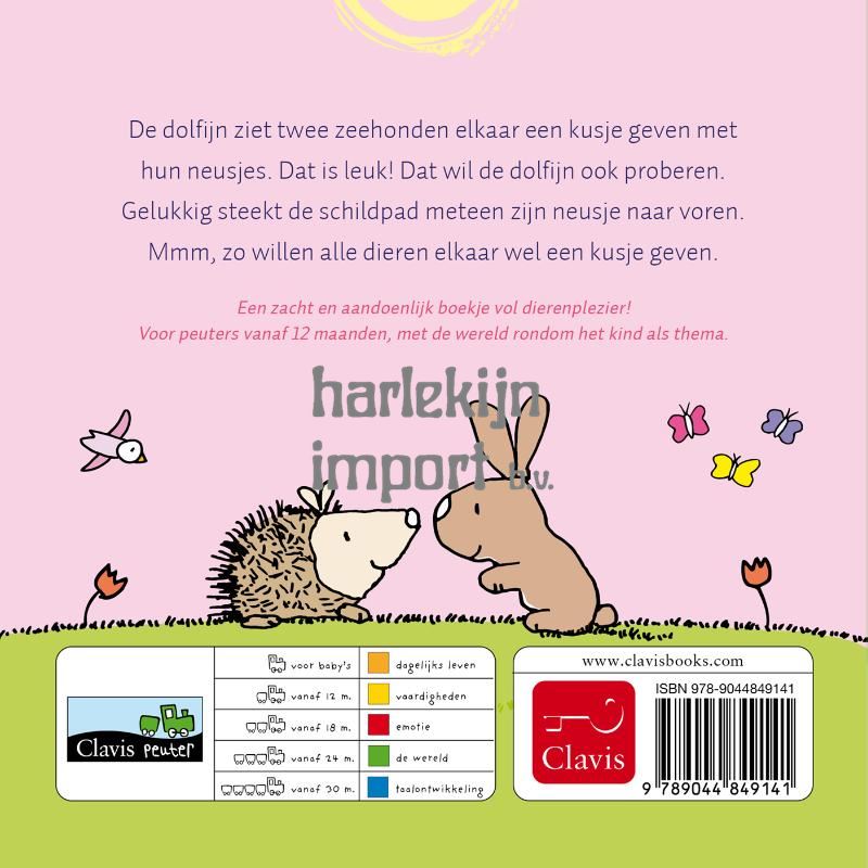 De dolfijn ziet twee zeehonden elkaar een kusje geven met hun neusjes. Dat is leuk! Dat wil de dolfijn ook proberen. Gelukkig steekt de schildpad meteen zijn neusje naar voren. Mmm, zo willen alle dieren elkaar wel een kusje geven. Een zacht en aandoenlijk boekje vol dierenplezier! Voor peuters vanaf 12 maanden, met de wereld rondom het kind als thema.