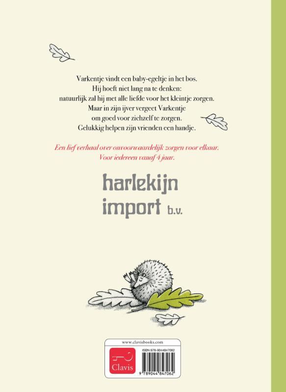 Varkentje vindt een baby-egeltje in het bos. Hij hoeft niet lang na te denken: natuurlijk zal hij met alle liefde voor het kleintje zorgen. Maar in zijn ijver vergeet Varkentje om goed voor zichzelf te zorgen. Gelukkig helpen zijn vrienden een handje. Een lief verhaal over onvoorwaardelijk zorgen voor elkaar. Voor iedereen vanaf 4 jaar.