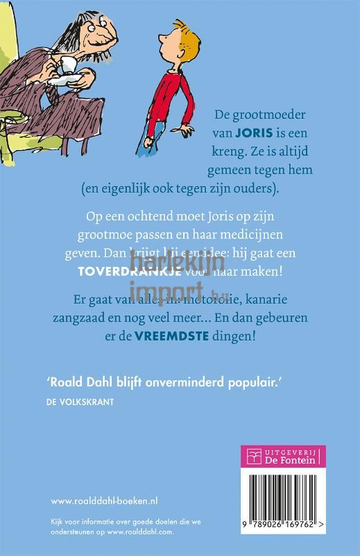 Joris en de geheimzinnige toverdrank is een fantastisch kinderboek van de wereldberoemde bestsellerauteur Roald Dahl. Met prachtige tekeningen van bekroond illustrator Quentin Blake.Joris woont op een boerderij, ver van alles af. Op een zaterdagochtend moet hij in zijn eentje op zijn grootmoeder passen, maar Joris haat zijn grootmoe, dat akelige, hekserige ouwe wijf. Hij bedenkt een plan: hij gaat een toverdrankje voor haar maken. Er gaat van alles in: kanariezangzaad, varkenstabletten, motorolie en nog veel meer. Grootmoe drinkt het drankje en ze groeit en groeit. Ze gaat door het plafond en zelfs door het dak heen! Wanneer Joris en zijn vader besluiten nog meer toverdrankjes te gaan maken, gebeuren de vreemdste dingen.‘Roald Dahl is de beste kinderboekenschrijver ter wereld.’ – VPRO-gids