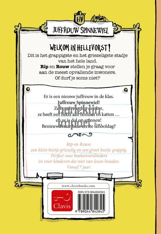 Welkom in Hellevorst! Dit is het grappigste en het griezeligste stadje van het hele land. Rip en Rouw stellen je graag voor aan de meest opvallende inwoners. Of durf je soms niet? Er is een nieuwe juffrouw in de klas. Juffrouw Spinnewiel! Ze houdt van het donker, ze heeft een hekel aan honden en katten ... en ze is dol op spinnen! Benieuwd naar haar eerste schooldag? Rip en Rouw: een klein beetje griezelig en een groot beetje grappig. Perfect voor boekenverslinders én voor kinderen die niet van lezen houden. Vanaf 7 jaar.