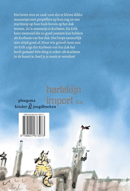 Het komt niet zo vaak voor dat kleine dikke mannetjes met opklapbare propellers op hun rug en een startknop op hun buik boven op het dak wonen. Zo'n mannetje is Karlsson. En Erik kent niemand die zo goed kan 'figureren', 'tiriteren' en poetsen bakken als Karlsson van het dak...