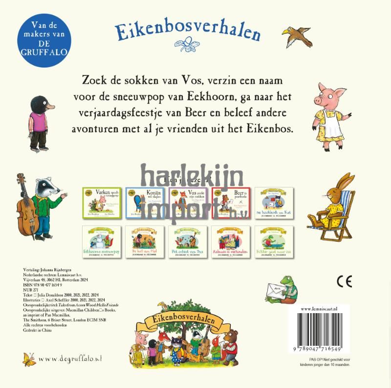 Zoek de sokken van Vos, verzin een naam voor de sneeuwpop van Eekhoorn, ga naar het verjaardagsfeestje van Beer, eet macaroni bij Kat en doe nog veel meer. In een heerlijk stevig kartonboek komen alle bekende karakters uit het Eikenbos van Julia Donaldson en Axel Scheffler aan bod. Een boek om op elk moment van de dag vriendjes te bezoeken, maar ook zeker geschikt voor ’s avonds bij het slapengaan, want dan kan je kleine een slaapliedje zingen voor Konijn. Slaap lekker, Konijn! En slaap lekker, kleine! Voor wie het nog niet wist: van de makers van De Gruffalo.