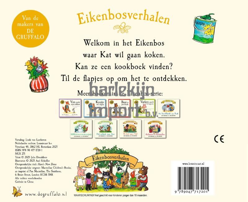 Al jarenlang genieten de jongste kinderen van de avonturen van de dieren uit het Eikenbos. Ze zoeken met Vos naar zijn sokken, spelen verstoppertje met Varken, bouwen een sneeuwpop met Eekhoorn en gaan slapen met Konijn. Er is weer een nieuw dier in het gezellige bos van het Gruffalo-duo Donaldson en Scheffler: Haas. Als de dieren een feest organiseren, krijgt Haas natuurlijk ook een uitnodiging. Tijd om een passende outfit te zoeken! In haar kast hangt een mooie jurk. Maar als Haas die wast, krimpt de stof… Lukt het Haas om op tijd een andere jurk te vinden? Natuurlijk valt er weer van alles te ontdekken onder de flapjes in deze heerlijke nieuwe titel op rijm in de klassieke Eikenbos-serie.