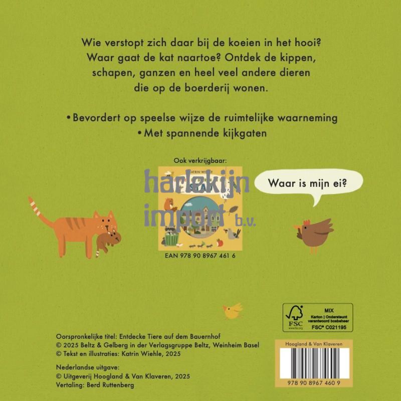 Wat doet de koe daar in de stal? Ah, ze wordt gemolken door de boerin! De verschillende stansvormen in dit kartonboek nemen de kleine lezertjes van buiten mee de koeienstal in, en vandaar naar het kippenhok en de paardenweide. De eenvoudige en duidelijke illustraties stellen kinderen vanaf 18 maanden in staat de bekende vormen, kleuren en dieren te herkennen. Met stansvormen voor een interactieve beleving!