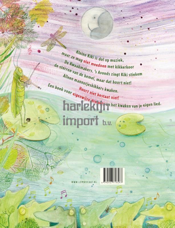 Iedereen weet dat alleen kikkermannetjes kunnen zingen. Alle kikkervrouwtjes vallen in katzwijm als het Kikkerkoor optreedt.Maar Kiki zingt ook graag. Dat hoort niet, vindt de kikkerdirigent, dus Kiki zingt alleen voor zichzelf, voor de maan en voor de krekel die viool speelt.Op een dag, juist als het Kikkerkoor weer gaat optreden, komt er een reiger langs… En reigers zijn verzot op kikkers.Zonder dat ze het doorheeft, weet Kiki een ramp te voorkomen. Een vrolijk kwakend en ook ontroerend prentenboek over gelijkwaardigheid, geloven in jezelf en het volgen van je dromen.