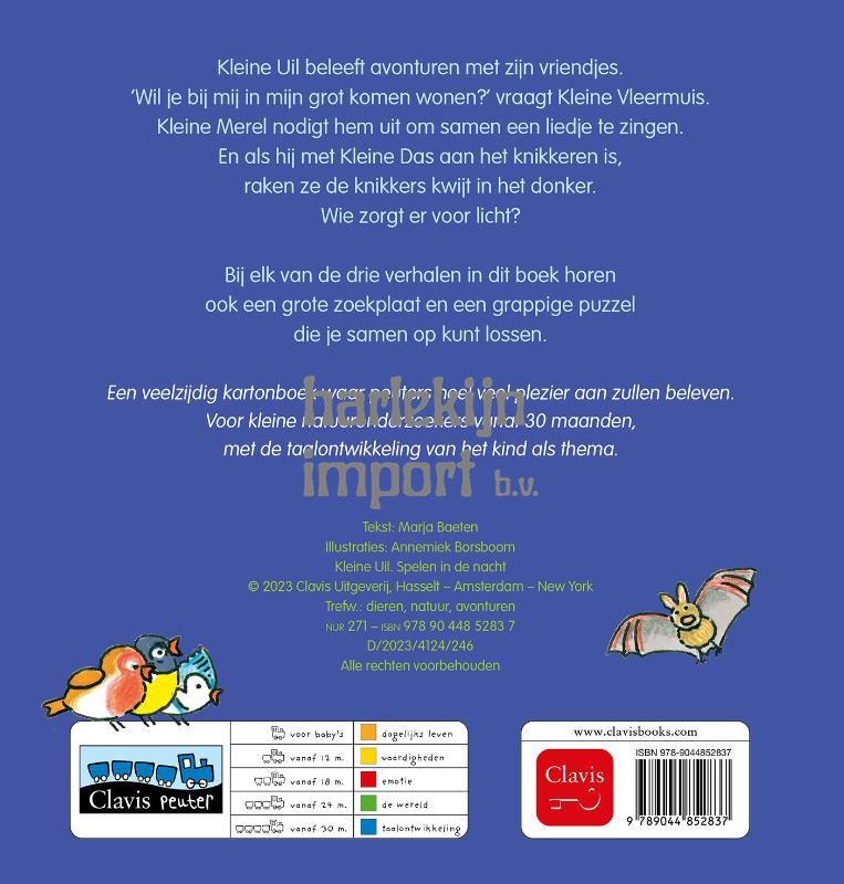 Kleine Uil beleeft avonturen met zijn vriendjes. ‘Wil je bij mij in mijn grot komen wonen?’ vraagt Kleine Vleermuis. Kleine Merel nodigt hem uit om samen een liedje te zingen. En als hij met Kleine Das aan het knikkeren is, raken ze de knikkers kwijt in het donker. Wie zorgt er voor licht? Bij elk van de drie verhalen in dit boek horen ook een grote zoekplaat en een grappige puzzel die je samen op kunt lossen. Een veelzijdig kartonboek waar peuters heel veel plezier aan zullen beleven. Voor kleine natuuronderzoekers vanaf 30 maanden, met de taalontwikkeling van het kind als thema.