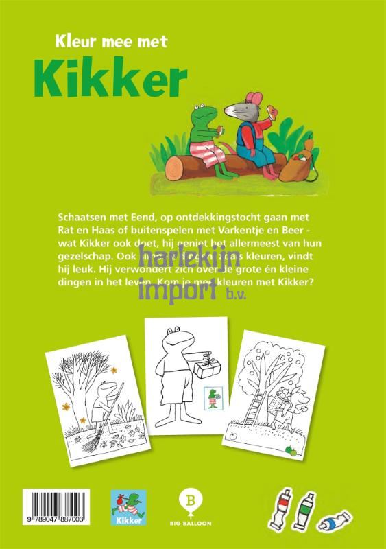 Wat Kikker ook doet, hij geniet het allermeest van het gezelschap van zijn vrienden: Schaatsen met Eend, op ontdekkingstocht gaan met Rat en Haas of buitenspelen met Varkentje en Beer. Ook simpele dingen, zoals kleuren, vindt hij leuk. Hij verwondert zich over de grote én kleine dingen in het leven. Kleur je mee met Kikker? Wat is er nou fijner dan een middagje kleuren aan de keukentafel? Met een kleurboek- of doeboek ontwikkelen kinderen niet alleen hun motoriek, maar ook hun creativiteit en fantasie. En ze maken nog iets moois ook! Iedereen is dol op Kikker, de vrolijke hoofdpersoon uit de boeken van Max Velthuijs. Samen met vriendjes Varkentje, Eend, Rat en Haas beleeft hij veel avonturen en laten ze de kracht van vriendschap zien.