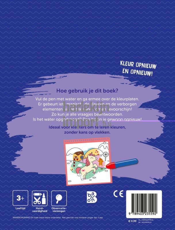 Fans van eenhoorns in huis? Dan is dit magische kleurboek iets voor jullie. Vul de pen met water en ga ermee over de kleurplaten. Er gebeurt iets magisch: de kleuren en de verborgen elementen uit de tekening komen tevoorschijn! Zo kun je alle vraagjes beantwoorden. Is het water opgedroogd? Dan begin je gewoon opnieuw! Ideaal voor kleuters om te leren kleuren, zonder kans op vlekken.