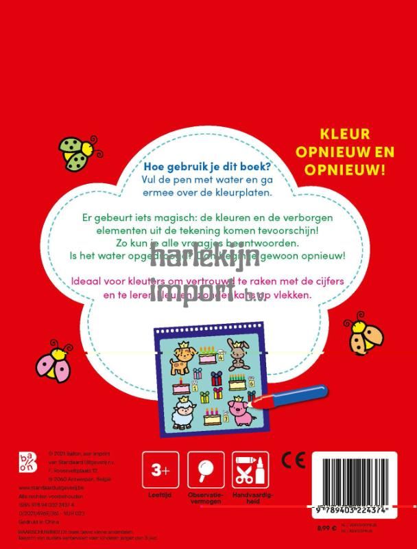 Met dit boek om te leren tellen is er echte magie in het spel! Vul de bijhorende pen met water en kleur ermee op de pagina’s. Alle kleuren komen tevoorschijn. Nadat alles weer is opgedroogd, verdwijnen de kleuren weer zodat je elke keer opnieuw kunt beginnen. Bij elke tekening staan ook enkele zoekvraagjes die je pas kunt oplossen wanneer je alle details tevoorschijn hebt getoverd. Ideaal voor kleuters om vertrouwd te raken met de cijfers en te leren kleuren, zonder kans op vlekken.