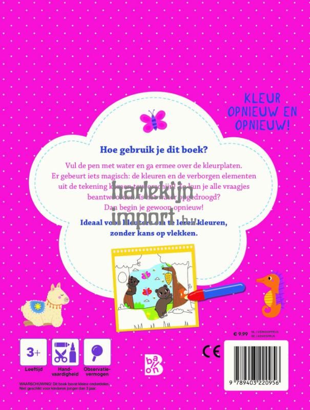 Vul de bijhorende pen met water en kleur ermee op de pagina’s.
