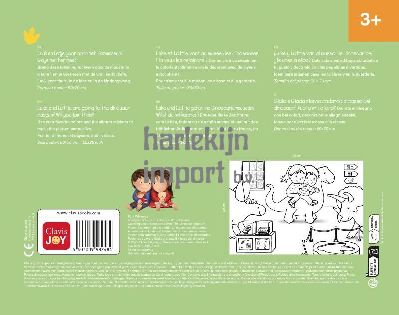 Luuk en Lotje gaan naar het dinomuseum! Ga je met hen mee? Breng deze tekening tot leven door ze mooi in te kleuren en te versieren met de vrolijke stickers. Leuk voor thuis, in de klas en in de kinderopvang. Formaat poster: 50x70 cm