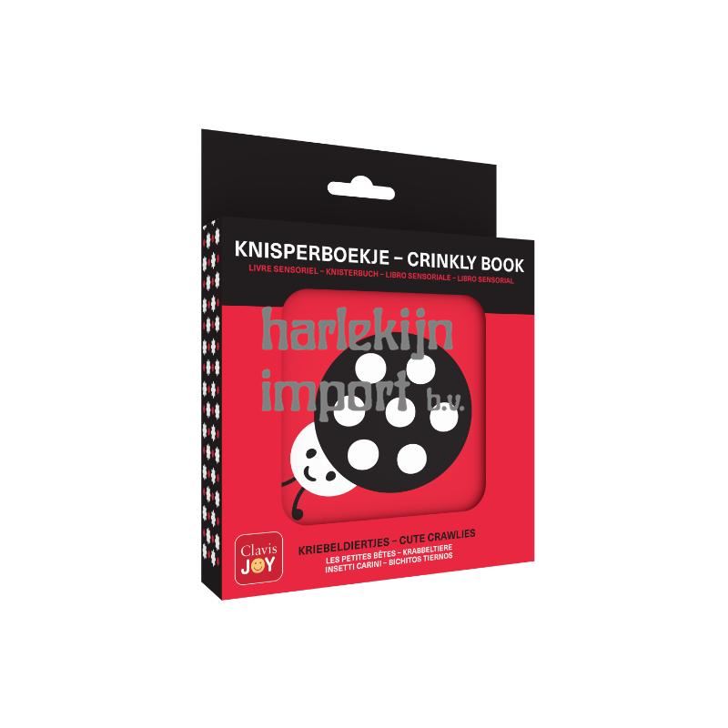 Een knisperboekje in zwart-wit, met vrolijke kleuraccenten voor baby’s.