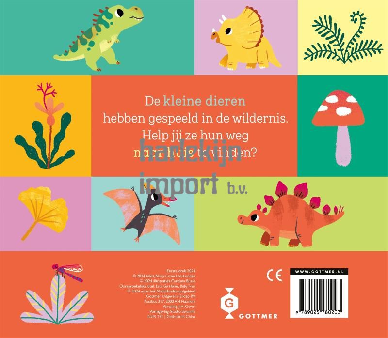 Help vier babydino's de weg naar huis te vinden in het peuterboek 'Kom je thuis, kleine dino?'. Peuters kunnen zelf de paden volgen met behulp van de schuifjes. Zo begeleiden ze de babydinosaurus t. rex, stegosaurus, pterodactylus en triceratops terug naar hun huis. Dit speelse prentenboek stimuleert met de schuifjes de hand-oogcoördinatie en fijne motoriek van dreumesen en peuters. De eerste woordjes en begrippen sluiten aan bij de belevingswereld van jonge kinderen. Door de illustraties aan te wijzen en de woordjes te benoemen, wordt de woordenschat spelenderwijs vergroot. Illustrator en animator Carolina Búzio brengt met meer dan tien jaar ervaring in grafisch ontwerp een unieke sfeer en emotie in haar illustraties. Haar werk, bekend om zijn originaliteit, maakt van dit boek een visueel feestje voor kindjes. De boekjes in de 'Kom je thuis?'-serie zijn leuk voor kinderen vanaf 18 maanden.
