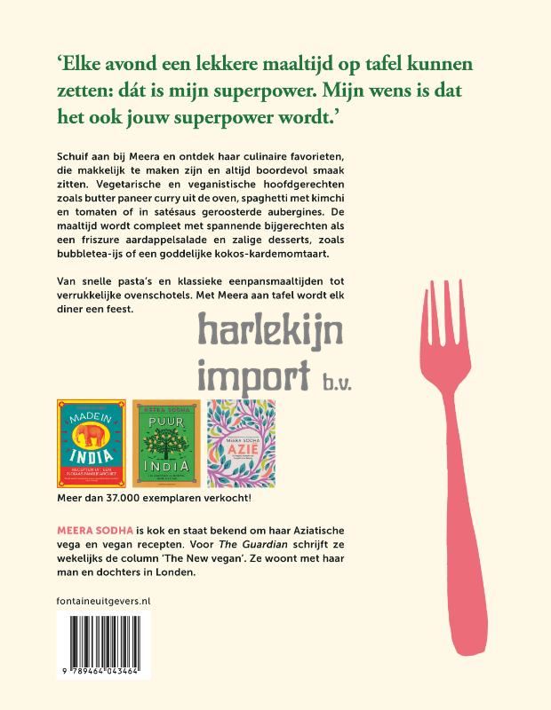 120 keer antwoord op de vraag: 'Wat eten we vandaag?' in Meera Sodha's persoonlijkste boek tot dusver In de meeste huishoudens is het een dagelijks terugkerende vraag:‘Wat eten we vandaag?’. Bestsellerauteur Meera Sodha geeft ons het antwoord. In haar nieuwste boek verzamelde ze 120 gezonde en smakelijke vegan en vega recepten voor het avondeten. Daarbij put ze uit een breed scala aan Europese, Aziatische en Midden-Oosterse keukens; van Italie, Turkije en Libanon tot India en Vietnam. Het zijn Meera’s persoonlijke favorieten die ze herontdekte tijdens een moeilijke periode, van klassieke eenpansmaaltijden en verrukkelijke ovenschotels tot supersnelle pasta’s. De maaltijden worden gecompleteerd met steengoede bijgerechten en afgesloten met waanzinnig lekkere desserts. In boter gebakken paneer, spaghetti met kimchi en tomaat, kokos-kardemomtaart en bubble tea-ijs: met Meera aan tafel wordt elk diner een feest. ‘Geweldig.’ - Nigella Lawson ‘Verleidelijk, uitnodigend en overheerlijk. Veganistische en vegetarische gerechten die niet te weerstaan zijn (en waarom zou je?).’ Yotam Ottolenghi ‘Meera kan toveren met een pak noedels, wat pindakaas en een stuk tofu...’ - Diana Henry ‘Ze heeft een schijnbaar magisch vermogen om je precies dat te vertellen wat je nodig hebt om een gerecht te laten zingen.’ - Bee Wilson ‘Elke avond goed kunnen koken is een van de belangrijkste ingrediënten voor een gelukkig leven.’ - Meera Sodha