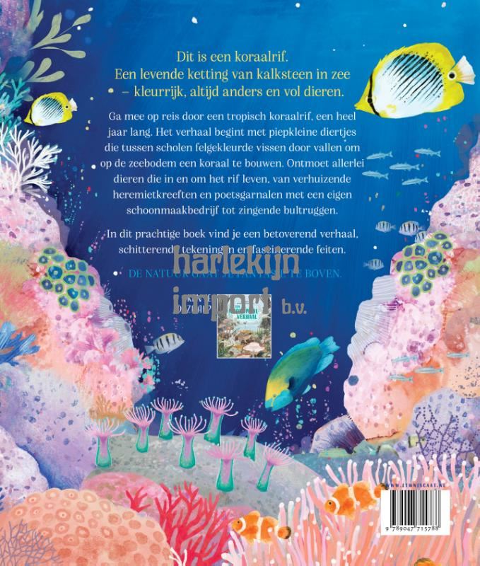 Dit is een koraalrif. Een levende ketting van kalksteen in zee – kleurrijk, altijd anders en vol dieren. In dit prachtige boek vind je een betoverend verhaal, schitterende tekeningen en fascinerende feiten over een van de meest kwetsbare gebieden op aarde. Ga mee op reis door een tropisch koraalrif, een heel jaar lang. Het verhaal begint met piepkleine diertjes die tussen scholen felgekleurde vissen door vallen om op de zeebodem een koraal te vormen. Ontmoet allerlei dieren die in en om het rif leven, van verhuizende heremietkreeften en poetsgarnalen met een eigen schoonmaakbedrijf tot zingende bultruggen. De natuur gaat je fantasie te boven. Een verhaal dat verwondert, betovert en inspireert om onze wereld te beschermen.