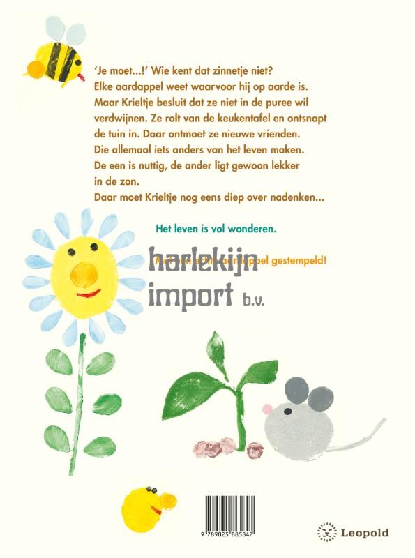 Elke aardappel weet waarom hij bestaat: om te worden gegeten! Maar Krieltje heeft andere ideeën en ze springt van de tafel naar buiten. ‘Wat ben jij?’ vraagt ze aan iedereen die ze tegenkomt. ‘En waarom ben jij op aarde?’ Roodborstje, worm, hommel, bloem en steen; ze geven allemaal een ander antwoord. Je kunt dus ook gewoon ‘zijn’ en van de zon genieten! Krieltje denkt diep na en valt in slaap en droomt. Als ze weer wakker wordt, is ze groot, zit ze vast in de grond, én heeft ze kleintjes gekregen. Waarvan er misschien wel één wegloopt om… astronaut te worden?