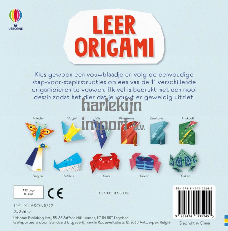 Trek een bladzijde uit het boek en volg de eenvoudige stap-voor-stap instructies voor het vouwen van een van de 11 verschillende origamidieren.