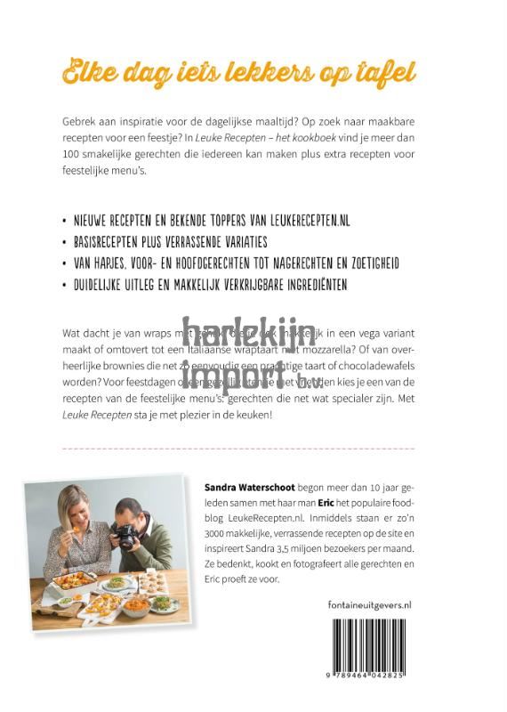 Herziene editie met nóg meer leuke recepten; al 10.000 exemplaren verkocht! De beste en lekkerste recepten van een van de grootste foodblogs van Nederland! LeukeRecepten.nl is de succesvolle foodblog van Sandra en Eric Waterschoot die al meer dan 10 jaar miljoenen mensen inspireert om lekker te koken. Het gelijknamige kookboek bevat makkelijke basisrecepten én vele verrassende varianten daarop. In deze herziene editie staan 8 splinternieuwe bonusrecepten voor het samenstellen van een feestelijk diner. Recepten die net wat specialer zijn, perfect om te serveren aan gasten. Voor een gezellig etentje met vrienden of familie, of de kerst. Van gevulde pastaschelpen met groenten tot een cranberry-cheesecake als dessert. En altijd makkelijk te bereiden zoals je van Sandra gewend bent. Dankzij dit boek staat zelfs de meest onervaren kok met plezier in de keuken! - meer dan 100 recepten - basisrecepten plus variaties - van hapjes, voor- en hoofdgerechten tot nagerechten en zoetigheid - duidelijke uitleg en makkelijk verkrijgbare ingrediënten Gebrek aan inspiratie voor de dagelijkse maaltijd? Op zoek naar maakbare recepten voor een feestje? Wat dacht je van wraps met gehakt die je ook heel makkelijk in een vega variant maakt of omtovert tot een Italiaanse wraptaart met mozzarella? Of van overheerlijke brownies met walnoten die net zo makkelijk een feestelijke taart of chocoladewafels worden? Met Leuke Recepten zet je elke dag iets nieuws op tafel. 'Een breed scala aan ingrediënten en smaken en daardoor voor iedereen wat wils. [...] Al doende leert men. En met dit kookboek kan dat op een fijne, laagdrempelige manier. ' - KOKEN EN GENIETEN 'Met het kookboek van foodblogger Sandra wordt iedereen een keukenprinses.' - VRIENDIN 'De recepten zijn niet alleen leuk, maar ook echt verrassend.' - HOLLANDS GLORIE