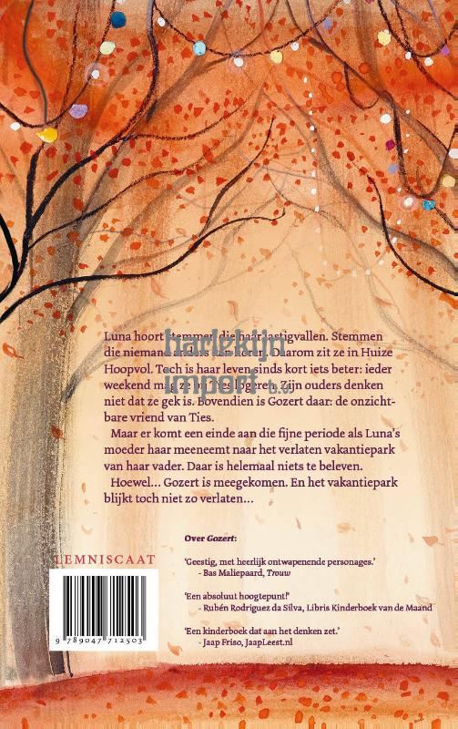 Luna hoort stemmen die haar lastigvallen. Stemmen die niemand anders kan horen. Daarom zit ze in Huize Hoopvol. Toch is haar leven sinds kort iets beter: ieder weekend mag ze bij Ties logeren. Zijn ouders denken niet dat ze gek is. Bovendien is Gozert daar: de onzichtbare vriend van Ties, die Luna ook kan horen.