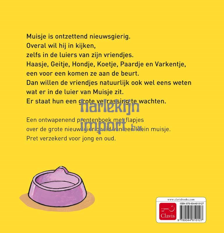Een ontwapenend prentenboek met flapjes, over de grote nieuwsgierigheid van een klein muisje. Pret verzekerd voor jong en oud. Nu samen met knuffel muisje! Muisje is ontzettend nieuwsgierig. Overal wil hij in kijken, zelfs in de luiers van zijn vriendjes. Haasje, Geitje, Hondje, Koetje, Paardje en Varkentje, een voor een komen ze aan de beurt. Dan willen de vriendjes natuurlijk ook wel eens weten wat er in de luier van Muisje zit. Er staat hun een grote verrassing te wachten.