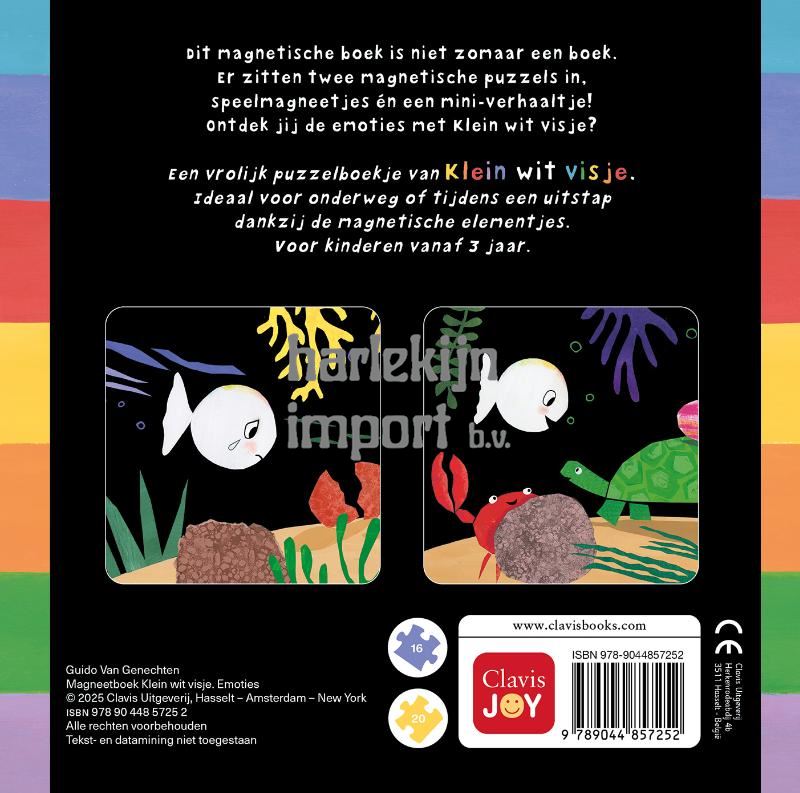 Dit magnetische boek is niet zomaar een boek. Er zitten twee magnetische puzzels in, speelmagneetjes én een miniverhaaltje! Ontdek jij de emoties met Klein wit visje? Een vrolijk puzzelboekje van Klein wit visje. Ideaal voor onderweg of tijdens een uitstap dankzij de magnetische elementjes. Voor kinderen vanaf 3 jaar.
