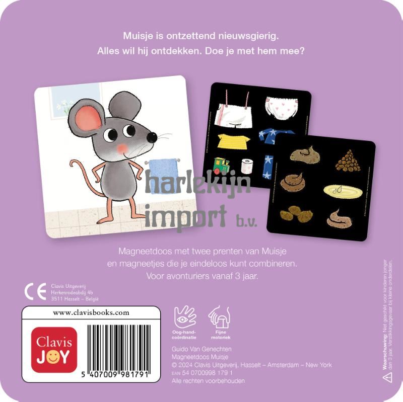 Muisje is ontzettend nieuwsgierig. Alles wil hij ontdekken. Doe je met hem mee? Magneetdoos met twee prenten van Muisje en magneetjes die je eindeloos kunt combineren. Voor avonturiers vanaf 3 jaar.